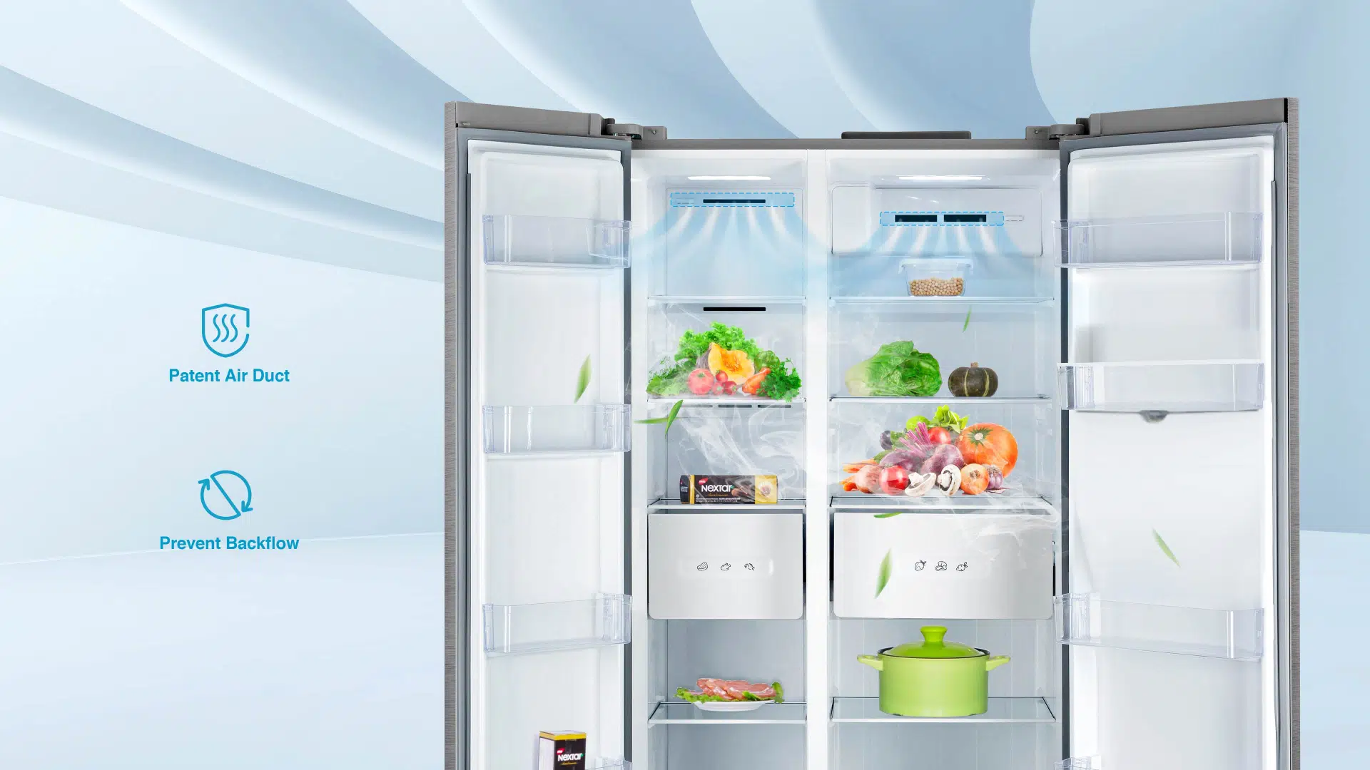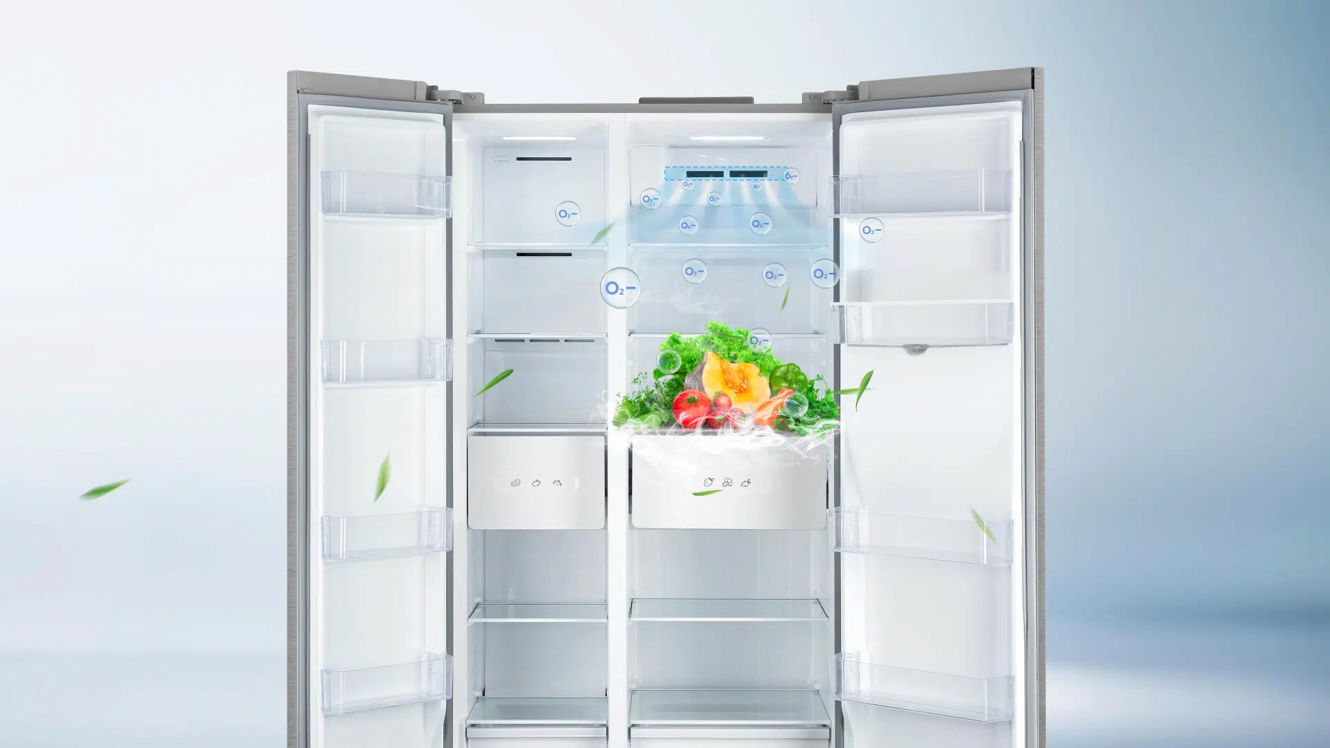 Acción antibacteriana a base de iones de oxígeno negativos que prolongan la frescura de los alimentos y reducen los olores.